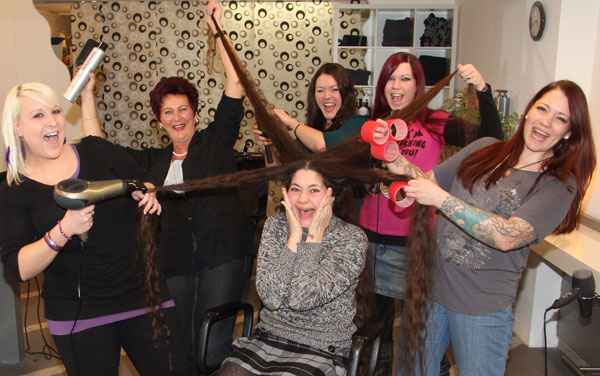 - Carolin Rehner (Gesellin) - Sonja Scherbaum (Gesellin) -Tamara Pfarr (Gesellin) - Anja Friedrich (Gesellin) - Senta Krumpholz (Inhaberin, Meisterin) - In der Mitte, sitzend: Eine zufriedene Langhaar Kundin!
